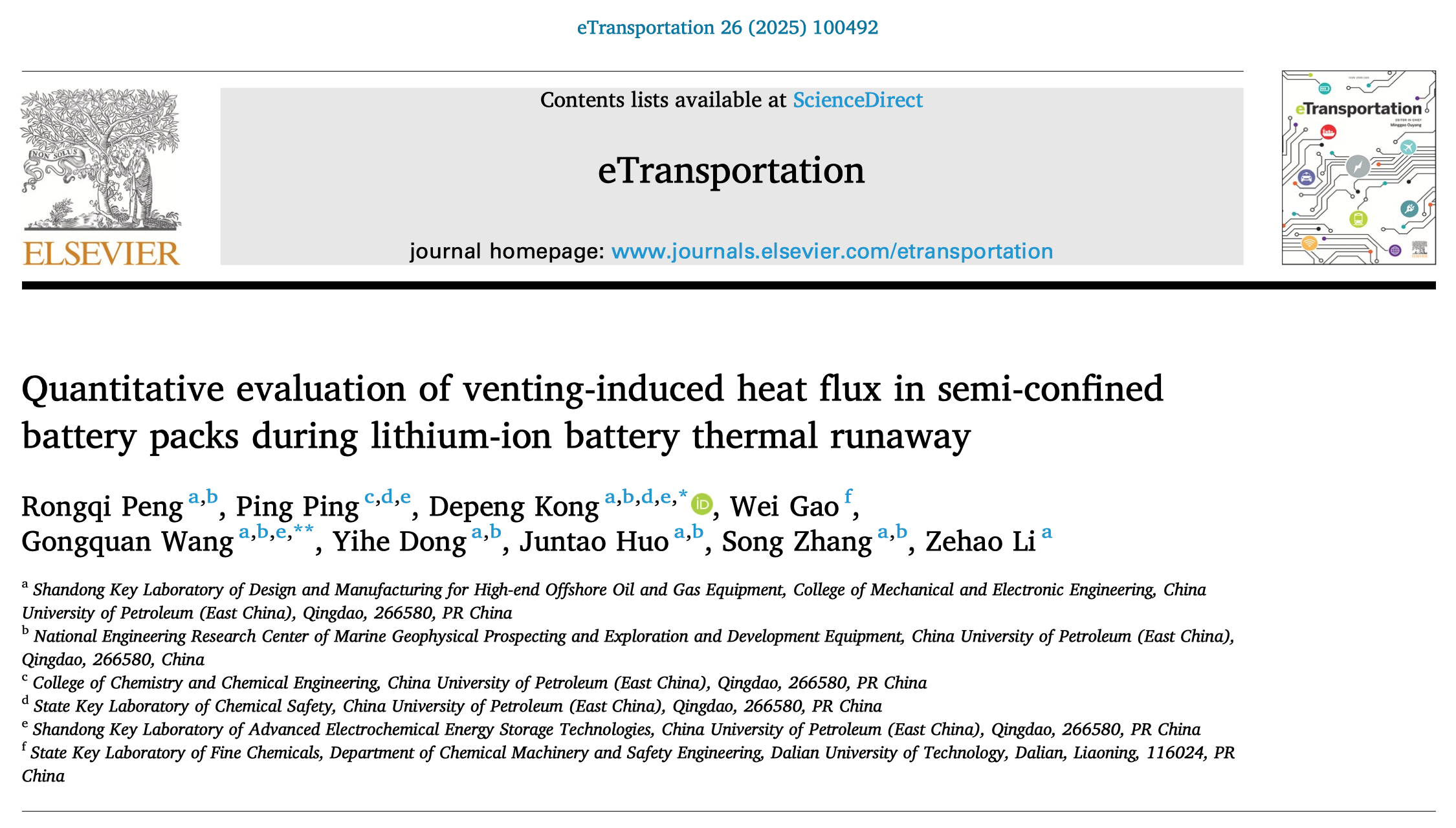 近日,我院安全工程博士研究生彭荣琦在锂离子电池热失控排气研究方面取得重要进展,相关研究文章《锂电池热失控排气热通量在半封闭电池包中的定量评估》(Quantitative evaluation of venting-induced heat flux in semi-confined battery packs during lithium-ion battery thermal runaway)发表在《eTransportation》。《eTransportation》是由交通电动化领域国际著名专家欧阳明高院士创刊建立,致力为全球学术和产业界服务的国际交通电动化期刊。目前期刊最新SCI影响因子17,中科院学术期刊工程技术领域Q1区的TOP期刊;位列全球交通科学技术领域的SCI学术期刊第1位。论文第一作者为博士研究生彭荣琦,通讯作者为孔得朋教授、青年教师王功全,中国石油大学(华东)为第一署名单位和唯一通讯单位,该研究得到了国家自然科学基金和国家重点研发计划的资助支持。
