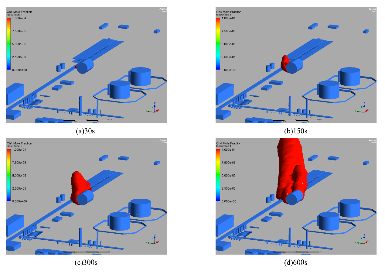 LNG泄漏模拟结果(泄漏源:BOG凝液罐;泄漏速率:18.08 kg/s;西风:2.45 m/s) |