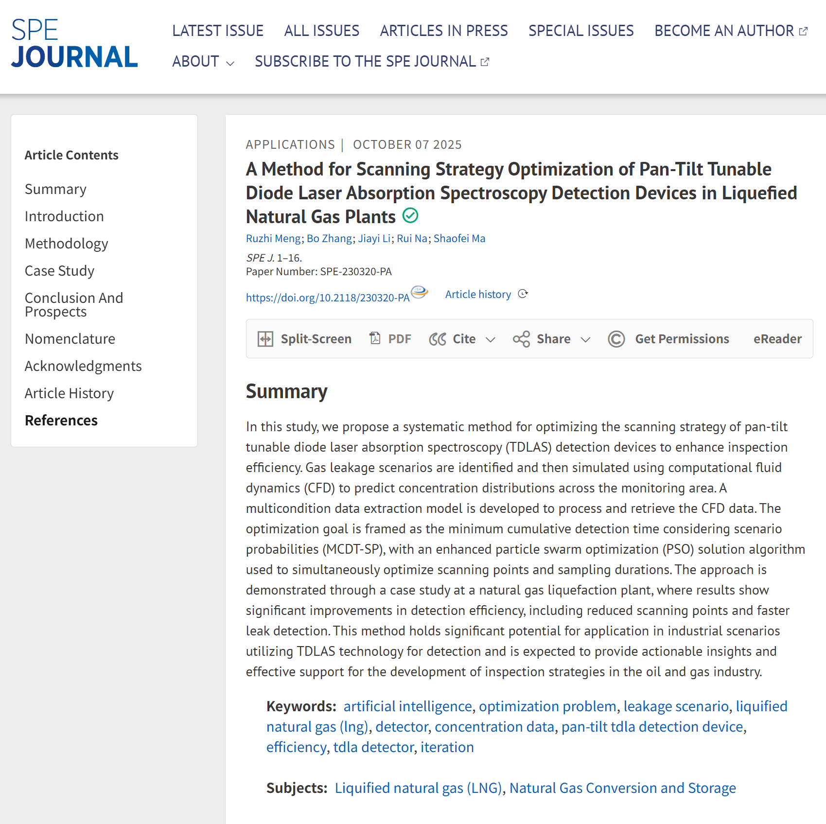 近日,我院安全工程专业2023级硕士研究生蒙汝枝在激光云台巡检方案优化方面取得进展,相关研究成果A Method for Scanning Strategy Optimization of Pan-Tilt Tunable Diode Laser Absorption Spectroscopy Detection Devices in Liquefied Natural Gas Plants发表在《SPE Journal》。《SPE Journal》是石油工程领域的国际权威期刊,我校认定的T2期刊。论文第一作者为蒙汝枝,通讯作者为章博副教授,中国石油大学(华东)为唯一署名单位和通讯单位,该研究得到山东省自然科学基金的资助支持。
