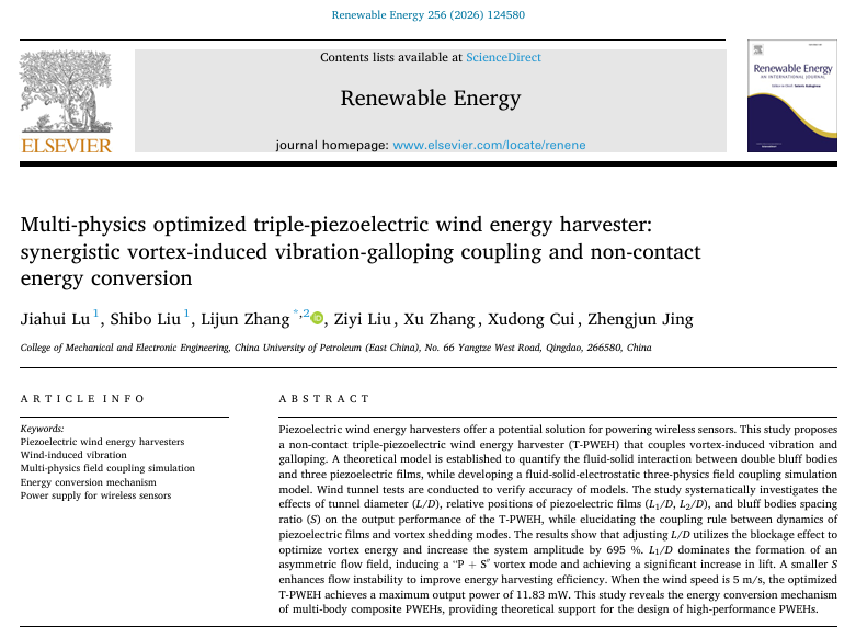 近日,我院张立军教授团队在压电风能收集技术研究领域取得阶段性进展,相关成果《多物理场优化的三压电片式风能收集器:协同涡驰耦合振动效应与非接触式能量转换》(Multi-physics optimized triple-piezoelectric wind energy harvester: synergistic vortex-induced vibration-galloping coupling and non-contact energy conversion)发表在《Renewable Energy》。该期刊是国际能源领域的知名学术期刊,主要关注可再生能源领域的研究进展和技术创新,最新影响因子为9.1(SCI一区Top)。硕士研究生鲁家惠和博士研究生刘世博为论文共同第一作者,张立军教授为通讯作者,中国石油大学(华东)为独立完成单位。该研究得到山东省自然科学基金项目、山东省科技型中小企业创新能力提升工程项目和新疆伊吾县科技创新专项资金项目的资助。